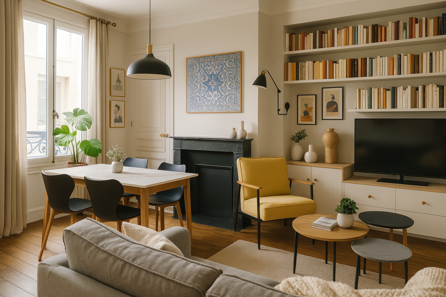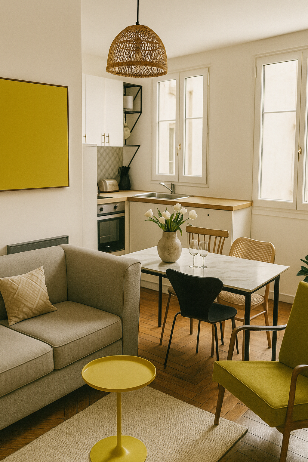 Ce projet d’accompagnement personnalisé a débuté avant même l’achat de cet appartement traversant de 61 m², situé dans le 20ᵉ arrondissement de Paris. Les clients, séduits par le potentiel du bien mais freinés par une organisation cloisonnée et une faible luminosité, ont souhaité être guidés dans leur décision.